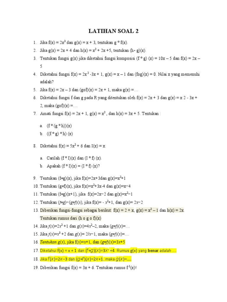 Untuk soal nomor 11 dan 15 perhatikan cartesius berikut. Berbekal fungsi f komposisi g (f o g)(x), kita akan mencari nilai dari fungsi g atau g(x). Sekarang akan dijelaskan lebih detil lagi. Rumus fungsi ((g h) f)(x) bentuk instrumen alokasi alat. Diketahui f(x) = 3x 1, g(x) = x + 6, dan h(x + 4) = 2x + 6.